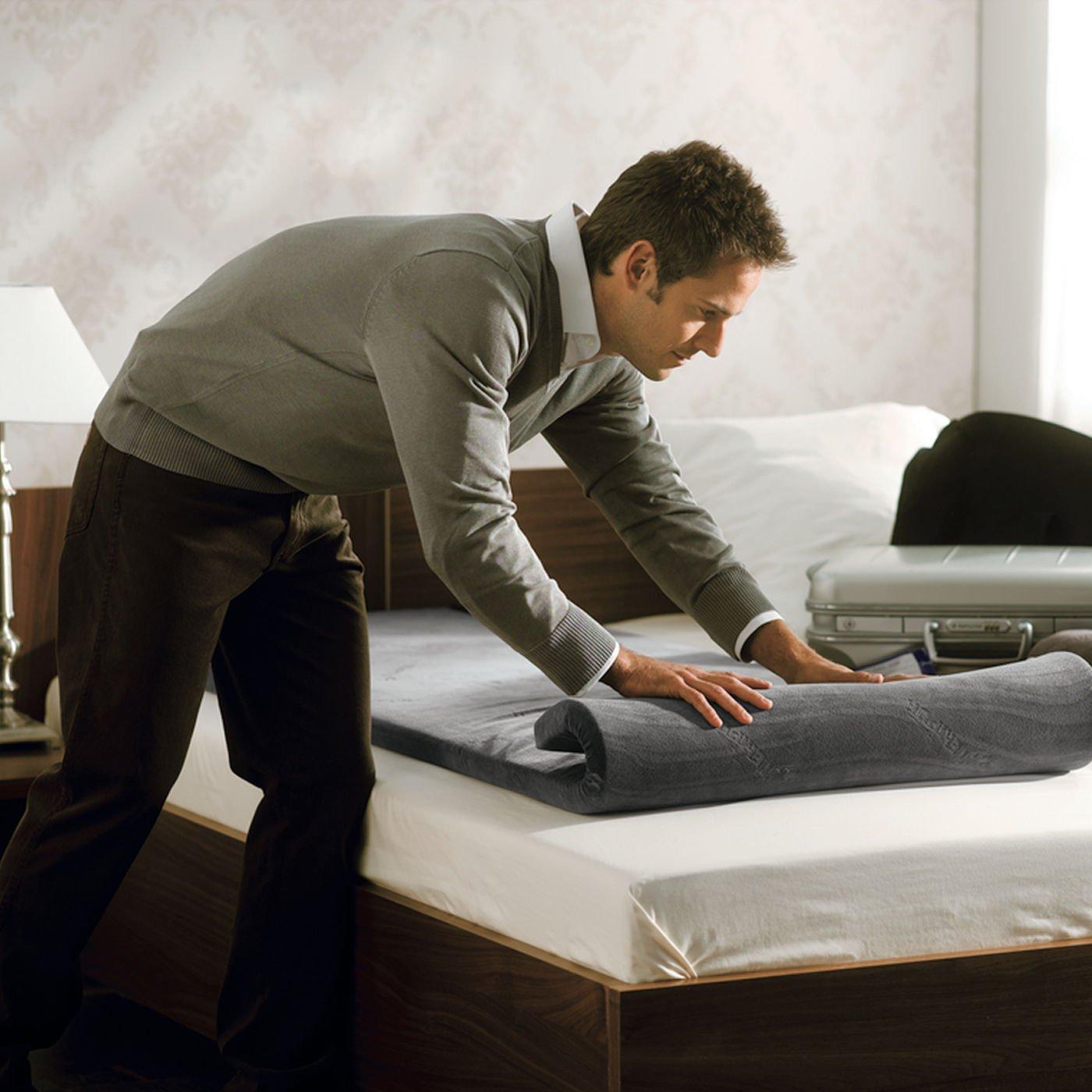 Ofrece un sistema de descanso portátil para aquellos que no pueden viajar sin su colchón y almohada TEMPUR. Este equipo ligero incluye un Sobre-Colchón de viaje y una Almohada Cervical Original media de viaje que se puede guardar en un estuche de viaje. El Set de Viaje se entrega en una bolsa tipo "trolley" para que se lo pueda llevar comodamente.